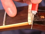 | Las tuercas se sacan fácilmente de las guitarras viejas, pero no de las nuevas con muchos acabados; a veces necesitará ver a través de la tuerca a lo largo (a través de las ranuras de cuerdas), deteniéndose cuando esté casi abajo. Con este hueco cortado en él, puede colapsar la tuerca hacia dentro sobre sí misma y retirar las piezas. Utilizo Fret End Nippers para apretar la tuerca dividida, pero un par de alicates sí. |