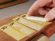 | Utilice la Regla de espaciado de cadena Una estas dos ranuras con la Regla de espaciado de cadena y utilícela para encontrar el espaciado adecuado para las cuatro cadenas restantes. La regla de espaciado de cadena localiza las posiciones de cadena para que las cadenas más pesadas obtengan el espaciado más amplio que necesitan. El espaciado de la regla es progresivo, por lo que cada espacio difiere exactamente del siguiente en 0,004". Esto crea la espaciado de cuerdas cómoda que los jugadores esperan de los instrumentos de calidad y elimina la necesidad de disponer el espaciado a la vista. Hay dos conjuntos de marcas en la regla: un conjunto se encuentra en los espacios entre el otro conjunto. Además, las ranuras de un conjunto están cerca del borde de la regla, mientras que el otro conjunto está ranurada más lejos del borde. Utilice cualquiera de los dos conjuntos de marcas, pero no mezcle las dos: elija las ubicaciones de la cadena del mismo conjunto. Si mezcla los dos, sus cuerdas estarán espaciadas irregularmente. Alinee cualquier ranura de la regla con su marca para la cadena E del triple. Cuente las marcas de tamaño a la izquierda (para un banjo o un bajo, cuente cuatro marcas). Si la sexta marca del mismo conjunto no coincide exactamente con su otra posición de cadena E, slide la regla hacia la derecha o hacia la izquierda hasta que encuentre una serie de seis marcas que coincidan perfectamente (puede encontrarla en cualquiera de los dos conjuntos de marcas). De nuevo, asegúrese de que todas las marcas son del mismo conjunto. Cuando haya encontrado el conjunto de seis marcas que se ajusten a su espaciado, lápizelo en la ubicación de las cuatro cuerdas centrales. Coloque la regla encima de la tuerca y use un lápiz muy afilado o un anotador para marcar a través de las ranuras. La ventaja de usar una lima es que rayará una ranura poco profunda que es fácil de seguir para una lima o sierra. |