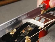 | ¡Cadena hacia arriba! Cadena la guitarra al tono y comprueba la altura de la cuerda y la forma de la tuerca. Si está satisfecho, afloje las cuerdas y pegue la tuerca ligeramente con 2 o 3 gotas pequeñas de pegamento Titebond. Sustituya las cuerdas rápidamente, vuelva a ajustar el paso y slide la tuerca de lado a lado para alinearla mientras el pegamento está húmedo y resbaladizo. Deje las cuerdas puestas para proporcionar presión de sujeción. Después de que el pegamento se seque durante una hora, estarás listo para tocar la guitarra, o mejor aún, continuar con tu próximo trabajo de fabricación de frutos secos. ¡Tus clientes estarán en la fila! |