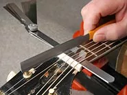 | Ajuste el blanco a la ranura . Cuadre con cuidado el blanco de la tuerca para ajustarlo a la ranura lijando su parte inferior y sus laterales sobre una superficie plana. Utilice cinta adhesiva de doble tira o papel de lija autoadhesivo para crear una superficie de lijado. No dedique más tiempo a un grano del necesario: preste atención al grosor del blanco y selector siempre al siguiente grano más fino ligeramente antes de pensar que realmente lo necesita. Evite que el blanco sea demasiado delgado para la ranura. Comience con grano 120 a 150 para aplanar y selector a grano 220 justo antes de que la tuerca encaje en la ranura. A continuación, el grano 320 añadirá el suavizado suficiente para dejar que el blanco caiga en la ranura. Cualquier papel de lija funcionará para esto, aunque mi favorito es el papel de lija dorado Mylar/con respaldo adhesivo Stikit. En mi tienda decimos que nos gusta "escuchar el clic de la tuerca en la ranura" (no espero que eso suceda la primera vez, pero podría suceder). Una serie de papeles de lija sujetos a una tabla de lijado plana es útil. Cada grano que necesita está ahí siempre. No lije los extremos del blanco, quiere que cuelgue de cada lado de la ranura. Lo recortarás y lo lijarás más tarde. Al dejar los extremos mucho tiempo, tiene la opción de golpear cualquiera de los extremos para cambiar la posición de la tuerca mientras trabaja. Los calibradores son una gran ayuda para dimensionar el blanco de la tuerca con precisión, pero una regla simple que mida en 64ths, junto con un buen ojo, lo hará. Rústica en la altura y forma de la tuerca La parte superior de la tuerca está formada para seguir el radio del cartón de viruta, y las ranuras de cuerda también siguen esta curva. Para permitir que las cuerdas despejen la parte superior del primer traste, la parte inferior de las ranuras debe ser 0,030" más alta que la altura del traste. Utilice las galgas de espesores para encontrar la altura del traste colocando un borde recto en dos trastes y combinando los calibres en una pila hasta que apenas se slide debajo del borde recto. Añada el calibre de 0,030" a esta pila (si ya está utilizando el calibre de 0,030", vuelva a combinar los calibres de las galgas para tener una pila que sea 0,030" más alta que la altura de la bandeja). Coloque la pila de galgas de espesores sobre el panel de trastes contra la tuerca, doblándolas para que coincidan con el radio del panel de trastes. Con un lápiz afilado, dibuje una línea en la tuerca que siga esta curva. Esta línea indica dónde debe estar la parte inferior de las ranuras de la cadena. Dibuje una línea más para marcar la parte superior de la tuerca: esta distancia debe ser la mitad del diámetro de la cadena más gruesa. Esto deja suficiente hueso para una ranura que sostiene las cuerdas sin ser demasiado profundas. Es mejor dejar un poco de altura; más tarde, ajustarás las alturas de las cuerdas bajando una ranura de cuerda a la vez. (Un medidor de radio también es una buena herramienta para dibujar estas líneas curvas en la cara de la tuerca). |
