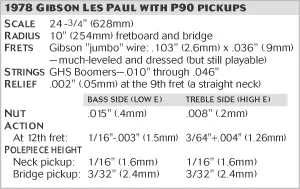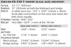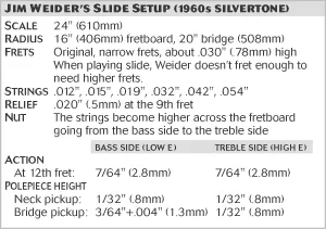 | Parte 2: Una guía para las grandes configuraciones Aquí tienes más de tres docenas de especificaciones de configuración precisas para guitarras que he medido mientras entrevistaba y escribía sobre los jugadores que actúan con ellos. Esto se extrae del libro Cómo hacer que tu guitarra eléctrica sea genial. Para obtener más información, fotos y descripciones, consulta el último capítulo de ese libro. (También incluye una "Configuración de guardabarros de 10 pasos".) Estas especificaciones de ejemplo se enumeran en el mismo orden en que aparecen en el libro. |