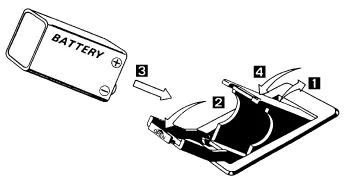 Tienda los cables de la caja de la batería y empuje la caja giratoria de la batería hasta su lugar, como se muestra en el diagrama de la derecha. Los pines de la caja encajan en los orificios de la carcasa. Recorte y suelde los cables en el circuito de control de la guitarra. Instale una batería de 9 voltios siguiendo los pasos que se muestran a continuación.
