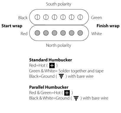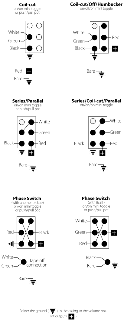 Un humbucker de 4 conductores tiene muchas opciones de cableado y tonal. Cuando se utilizan las siguientes opciones, el cable desnudo o blindado se suelda a "masa" en la carcasa del recipiente volumétrico.
