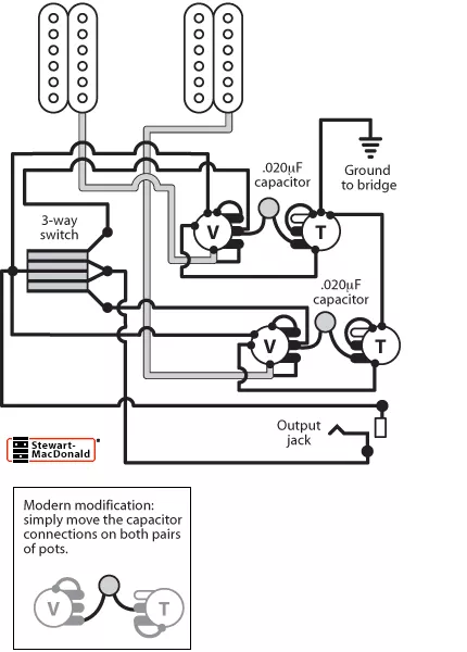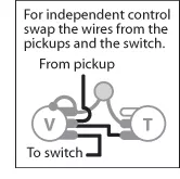 Cableado de control de volumen alternativo: puede cable ambos controles de volumen de un Les Paul (o cualquier otro instrumento de control de volumen doble) para que pueda mezclar el volumen de las tomas de forma independiente. Esto resuelve el problema en la posición central del selector selector, donde al bajar un control de volumen se afectan ambos captadores.
