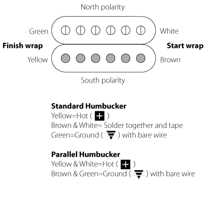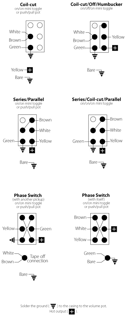 Un humbucker de 4 conductores tiene muchas opciones de cableado y tonal. Cuando se utilizan las siguientes opciones, el cable desnudo o blindado se suelda a "masa" en la carcasa del recipiente volumétrico.