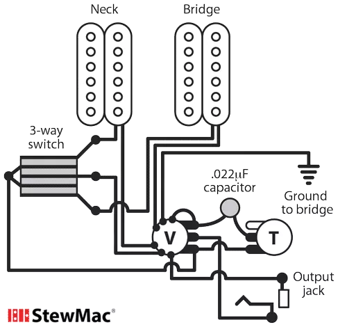 Este diagrama de cableado es adecuado para cualquierpastilla guitarra de dos piezas con humbuckers, bobinas individuales o una combinación de ambas (volumen maestro, tono maestro).