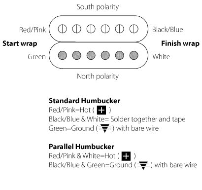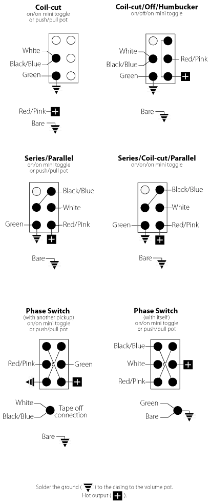Un humbucker de 4 conductores tiene muchas opciones de cableado y tonal. Cuando se utilizan las siguientes opciones, el cable desnudo o blindado se suelda a "masa" en la carcasa del recipiente volumétrico.