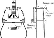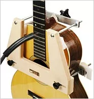 | Acople la plantilla Ajuste con cuidado el mástil de la guitarra a través de la abertura de la plantilla, como se ilustra. Ajuste las varillas roscadas para que se ajusten a la cintura de la guitarra. Si la guitarra tiene la espalda curvada, los discos de sujeción intentarán deslizarse bajo tensión; use la correa posterior con muescas para mantener estos discos en su posición. Alinee la punta del tornillo de presión para que coincida con el talón del mástil al apretar la plantilla. La barra de presión se ajusta para guitarras de varias profundidades. Coloque el protector triangular de condensador del talón entre el tornillo de presión y la condensador del talón para distribuir la presión. |