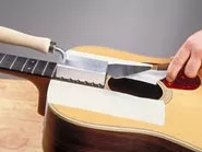 | Instrucciones Retirar un mástil de una unión de cola de milano es complicado y requiere vapor para aflojar el pegamento. ¡No intentes empujar el mástil hacia fuera solo con fuerza! El vapor de una olla a presión, cafetera para café espresso u otra caldera se inyecta profundamente en la junta del mástil a través de la aguja extralarga de nuestro vaporizador de juntas del cuello n.o 4059. Para obtener instrucciones detalladas, recomendamos el DVD n.o 5621 "Neck Resets" de Dan Erlewine. Afloje la lengüeta del diapasón antes de colocar la plantilla, deberá aflojar la extensión del fretboard sobre el cuerpo (la "lengua") calentándola con nuestro calentador de puente y hierro para Diapasón n.o 4607. Utilice una placa térmica para calentar la plancha hasta 250°F. Cuando el pegamento debajo de la diapasón se ablanda, puedes trabajar la lengüeta libre de la parte superior con nuestra cuchilla de extracción de puente/Diapasón n.o 4464. Tenga mucho cuidado, es posible que desee proteger la parte superior de la guitarra cubriendo el área de trabajo con cartón envuelto en papel de aluminio. Esto ayudará a proteger la parte superior del daño por calor. |