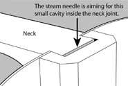 | Vaporizar la articulación del mástil El objetivo de la aguja de vapor es un pequeño espacio que existe entre el extremo del tenón del mástil y la pared del bloque del mástil (ilustrado). Esta cavidad generalmente cae debajo de un traste, el primer traste desde el borde del cuerpo. En muchas guitarras, el mástil se encuentra con el cuerpo en el 14o traste, y este espacio está por debajo del 15o traste. En el ejemplo de guitarra de nuestra foto, el mástil se encuentra con el cuerpo en el 12o traste, por lo que el espacio está debajo del 13o traste. Retire el traste y perfore un orificio de 1/16"-5/64" a través del centro de la ranura del traste y en la cavidad de la cola de milano (debe sentir que la broca golpea el hueco una vez que haya atravesado el diapasón). Inserte la aguja del vaporizador de cuello y articulaciones en la cavidad y comience a cocinar al vapor. Después de que el vapor ablande el pegamento en la articulación del mástil , mueva el mástil y gire el tornillo de presión para empujar el mástil fuera de la articulación. Continúe inyectando vapor durante toda la extracción. Cuando salga el mástil , apague inmediatamente el vapor y retire la plantilla y el papel de enmascarar del cuerpo de la guitarra. Seque inmediatamente cualquier resto de humedad. |