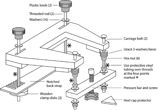 Monte la plantilla como se muestra en el diagrama. El tubo de vinilo se coloca sobre las varillas roscadas y los pernos de carro para que esas partes metálicas no arañen el acabado de la guitarra. Cada perno de carruaje se sujeta firmemente en la base de contrachapado con cinco arandelas y una tuerca hexagonal. Las otras tuercas hexagonales permiten ajustar la barra que sujeta el tornillo de presión.