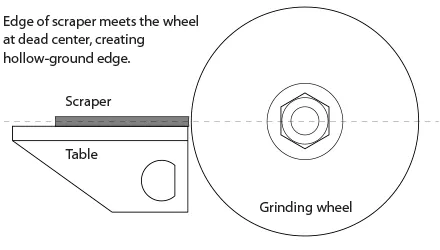 Configure para afilar el rascador definitivo. Con el raspador colocado en la mesa, coloque la mesa de modo que la rueda de rectificado se encuentre con el borde del raspador en el centro muerto. Apriete el perno de montaje de modo que la mesa quede firmemente sujeta en su lugar.