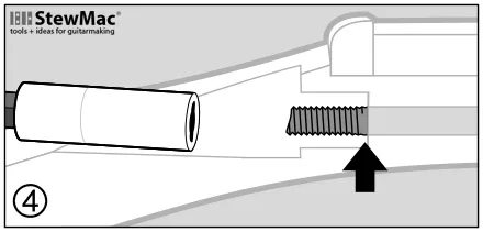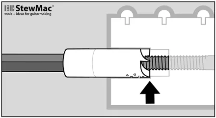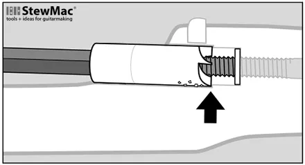 Paso 3 Cambie al troquel, utilizándolo con cuidado para que pueda sentir que se engancha en las roscas. Si las roscas dañadas dificultan el acoplamiento del troquel, utilice nuestra herramienta de biselado #6196 para eliminar las rebabas y coloque un extremo limpio en la varilla. Gire el troquel lentamente y deténgase cuando golpee la resistencia. Observe la posición de la llave en este punto y continúe un cuarto de vuelta; ya ha comenzado a cortar las roscas. Después del cuarto de vuelta inicial, retire el troquel y limpie sus roscas. Limpie también cualquier rasurado de la cavidad de la alma . Continúe cortando el rosca un cuarto de vuelta cada vez, deteniéndose para limpiar entre cada corte hasta llegar al fondo de la cavidad. Cortar demasiado rápido permite que las virutas se acumulen y ejerce tensión sobre la alma. Un poco de lubricante en el troquel, como vaselina, Guitar Grease, Tap-Ease, parafina o cera de abeja, facilitará el trabajo y producirá hilos más limpios. No recomendamos usar aceite ni ningún otro lubricante delgado que pueda filtrarse en la madera.