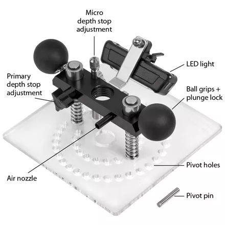 Al presionar uno de los orificios de la placa base sobre el pasador de pivote, el enrutador funciona como una brújula. Gira alrededor del clavo, cortando un círculo preciso.