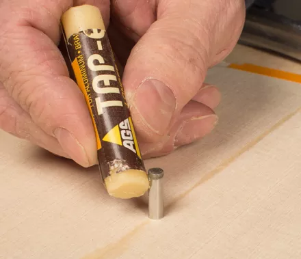 Coloque la parte superior de la guitarra en el pasador, colocándola plana sobre la mesa de trabajo de madera contrachapada. Los orificios de medición de la base de la plantilla se ajustan perfectamente al pasador del pivote. Lubrique el extremo del pasador con lubricante de corte Tap-Ease o cera para una rotación suave.