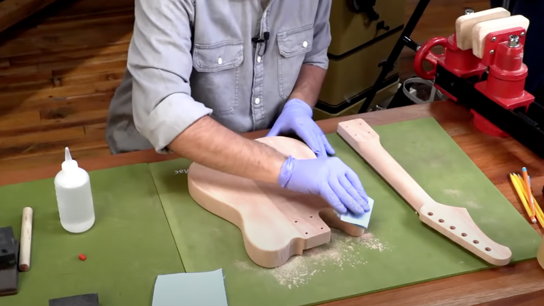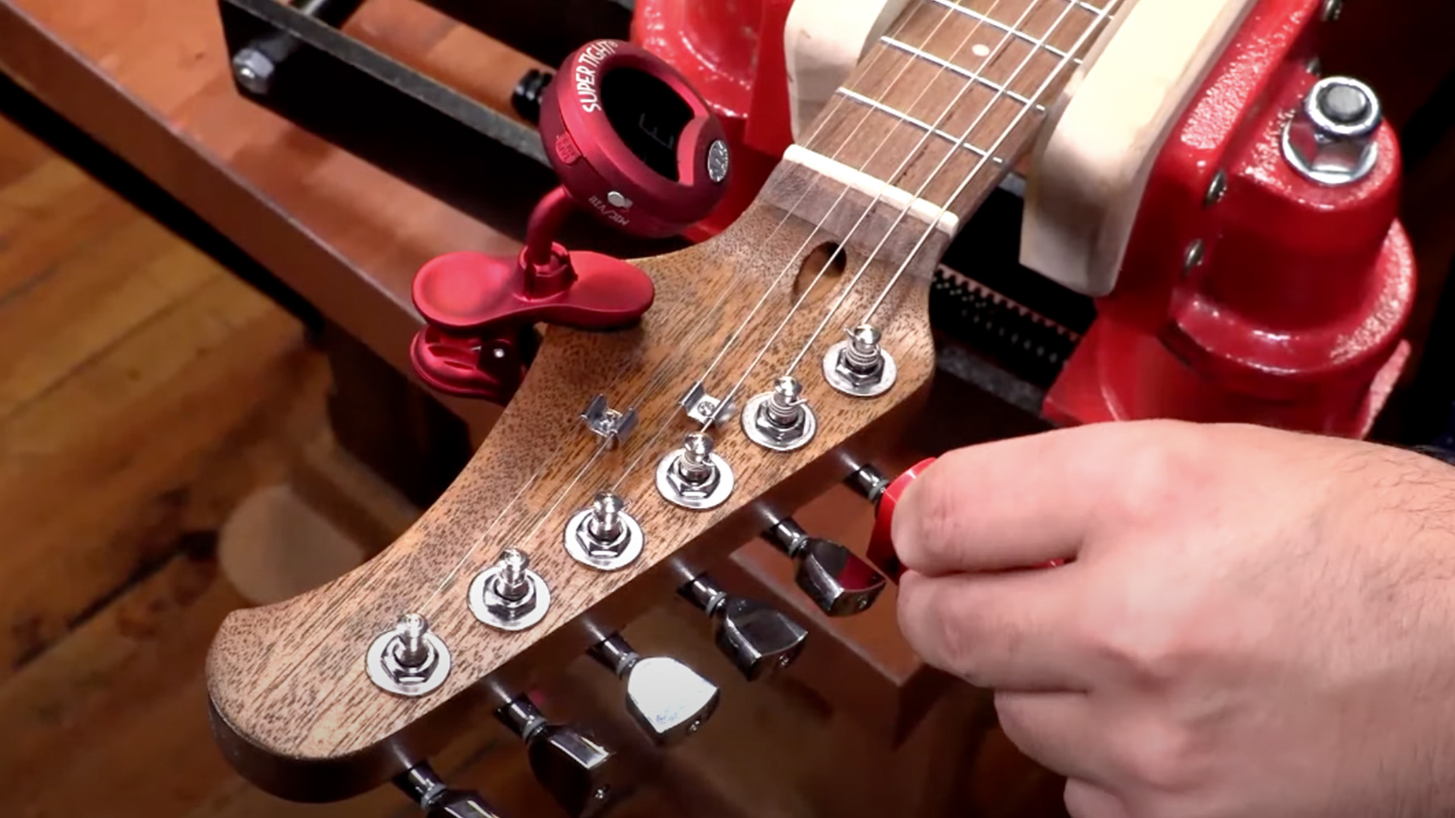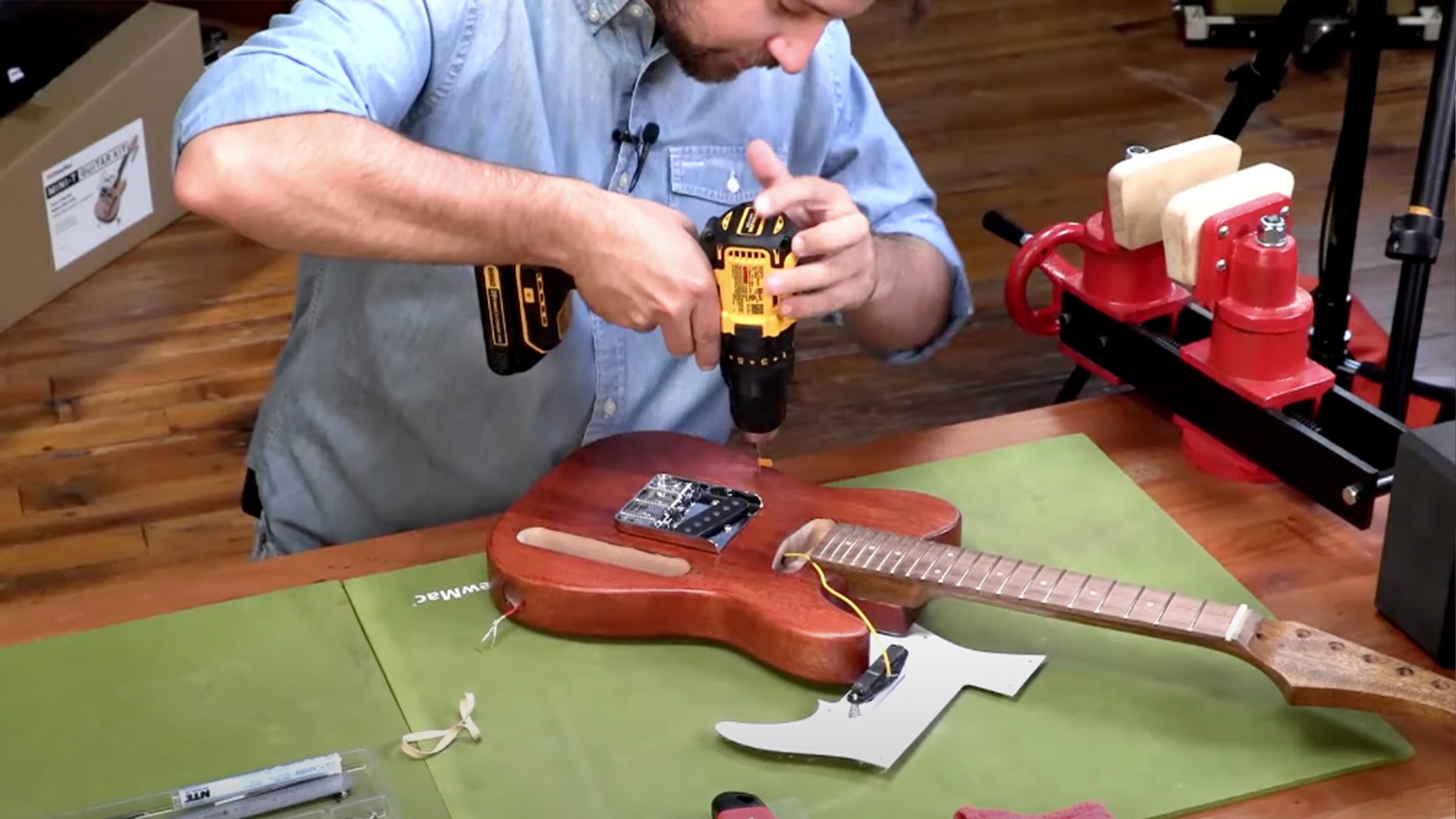 - Instalación del pickguard, el puente y clavijeros