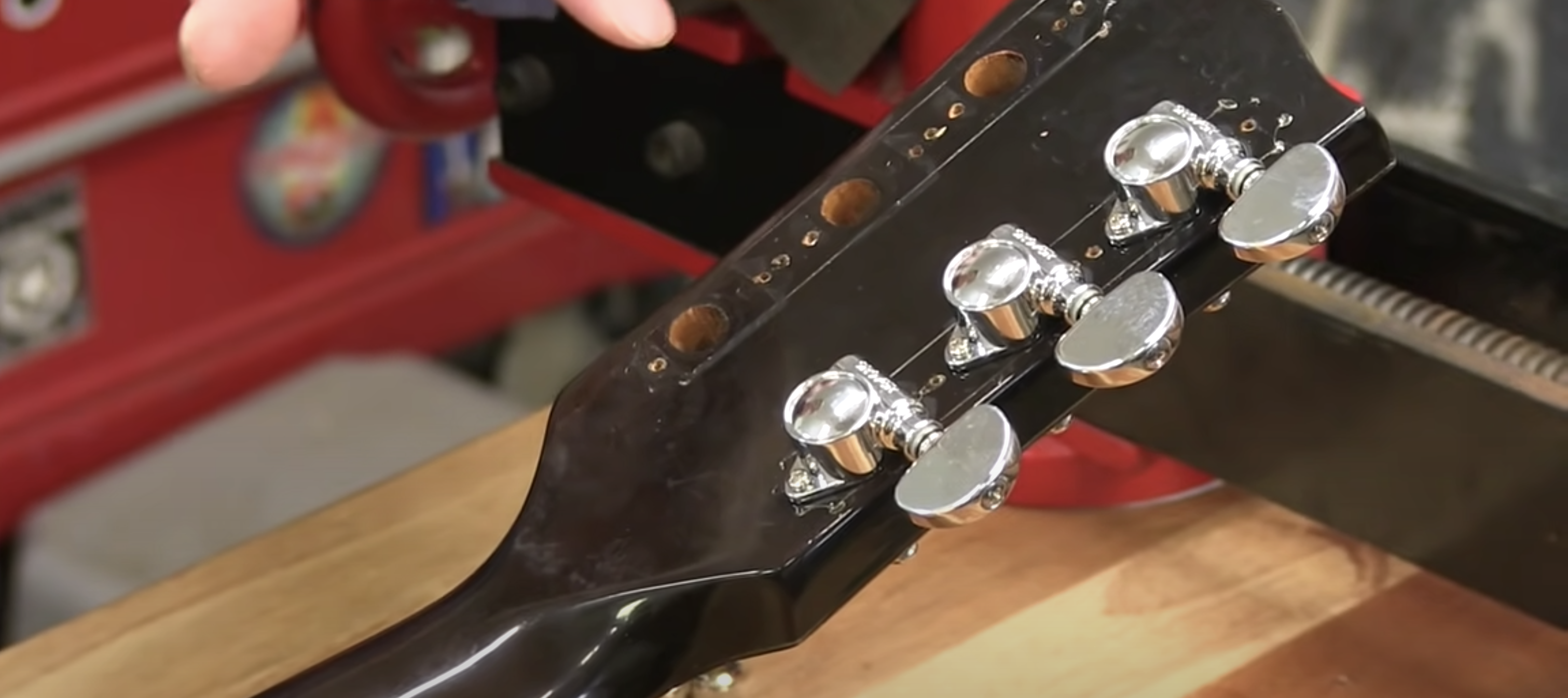 Le sobrarán algunos agujeros de las otras máquinas y hay un par de formas diferentes de tratarlos. Una es dejarlos abiertos como lo hice en esta guitarra en particular, de esa manera están listos si decides volver a instalar los clavijeros originales en algún lugar. Otra opción es simplemente tomar los tornillos de montaje antiguos y colocarlos. Esto mantiene los orificios libres de residuos o cualquier tipo de suciedad y humedad que pueda caer allí.